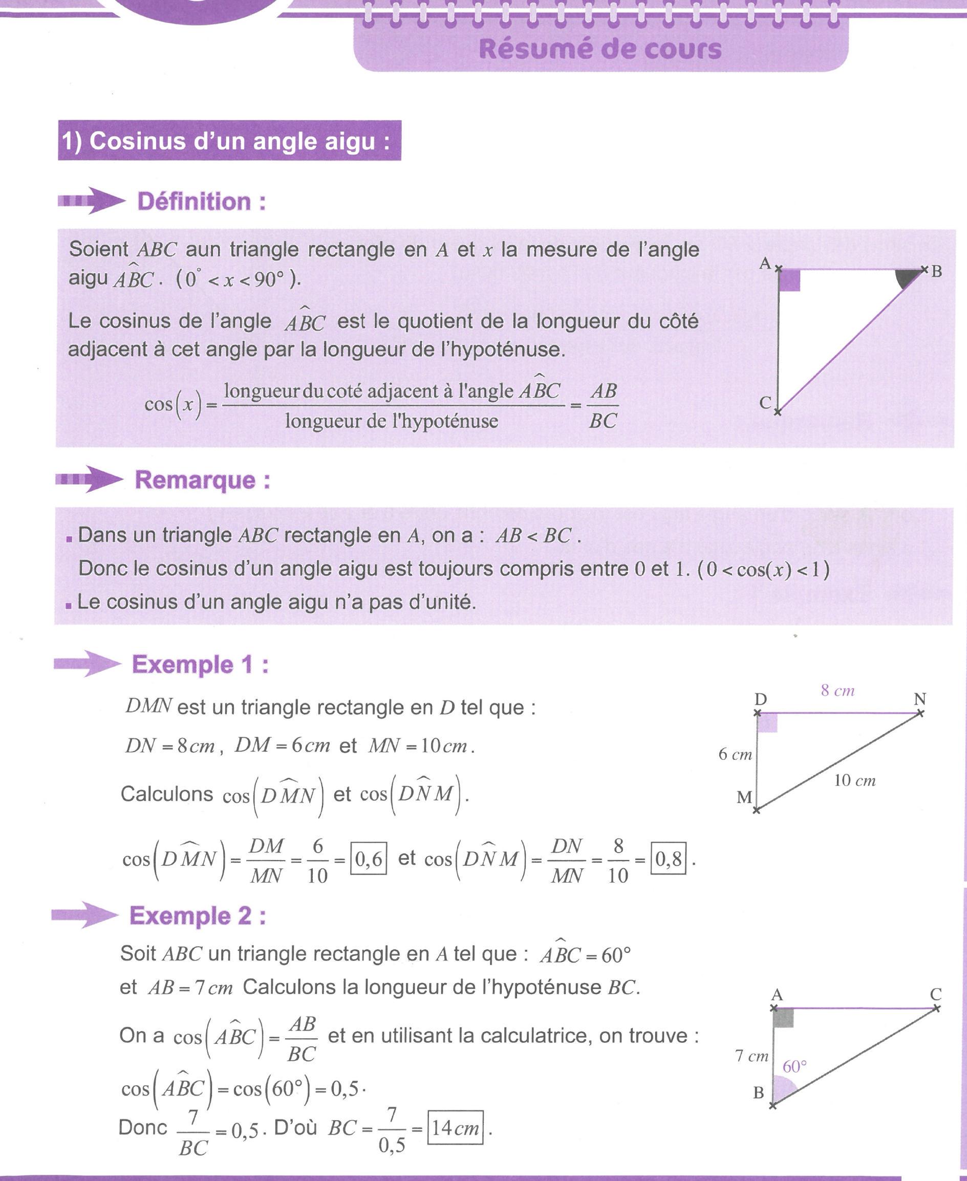 Donc le cosinus d'un angle aigu est toujours compris entre 0 et 1.(0 < cos(x) < 1)1 .(0<\cos (x)<1) - Le cosinus d'un angle aigu n'a pas d'unité.